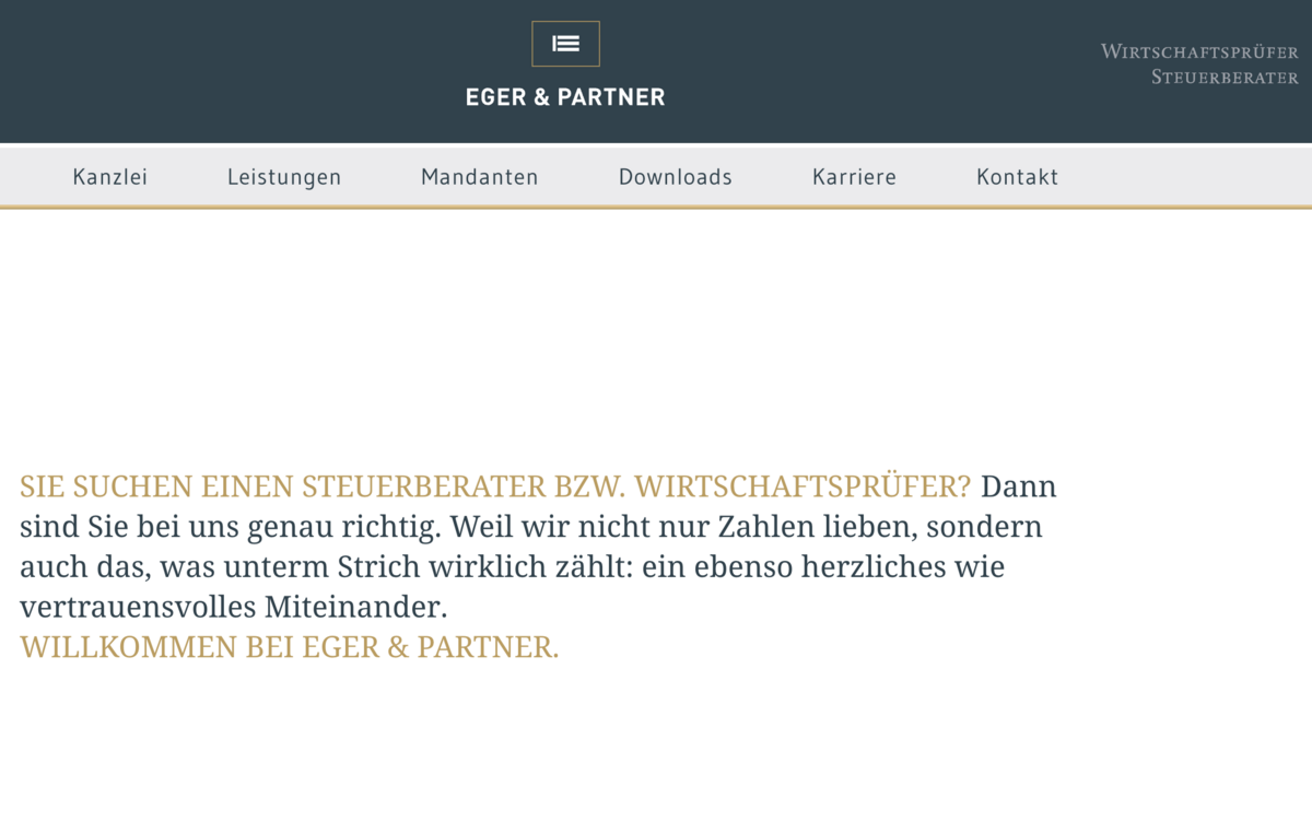 Für die Eger & Partner Steuerberater haben wir einen umfassenden Relaunch der Webseite mit TYPO3 realisiert. Die Kanzlei bietet seit 1975 professionelle Dienstleistungen in den Bereichen Steuerberatung, Wirtschaftsprüfung, Buchhaltung und Lohnabrechnung an. Das Team aus erfahrenen Steuerberatern, Wirtschaftsprüfern und Bilanzbuchhaltern betreut sowohl Privatpersonen als auch Unternehmen unterschiedlicher Branchen.