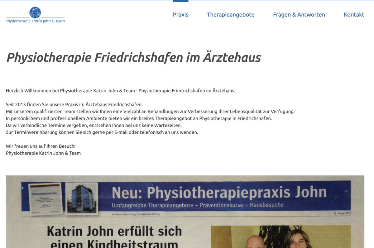 Für die Physiotherapie Katrin John & Team haben wir einen umfassenden Relaunch der Webseite mit TYPO3 realisiert. Die Praxis befindet sich seit 2013 im Ärztehaus Friedrichshafen und bietet ein breites Spektrum an physiotherapeutischen Leistungen an. Das qualifizierte Team stellt eine Vielzahl an Behandlungen zur Verbesserung der Lebensqualität zur Verfügung. In persönlichem und professionellem Ambiente werden die Patienten betreut.