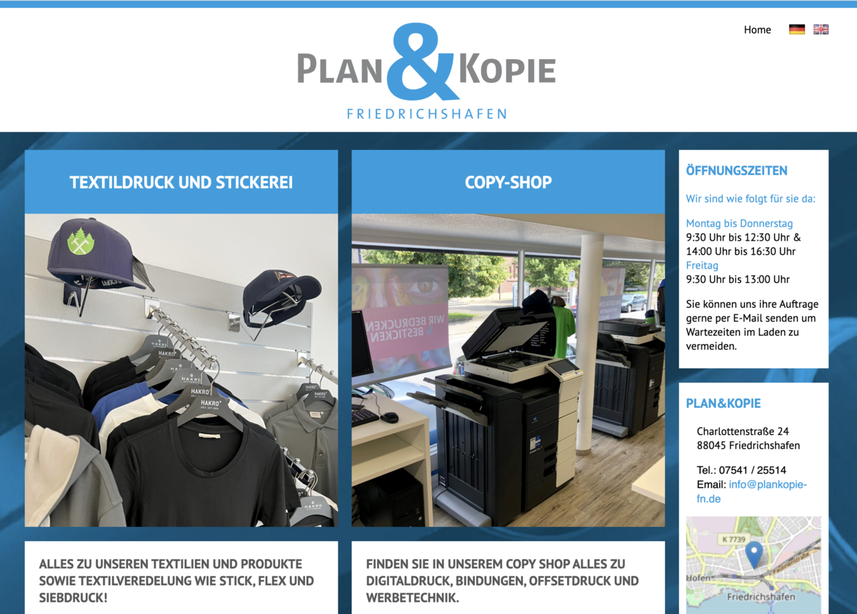 Für den etablierten Plan & Kopie Copyshop in Friedrichshafen haben wir einen umfassenden Relaunch der Webseite mit TYPO3 realisiert. Das Unternehmen bietet seit über 25 Jahren professionelle Dienstleistungen in den Bereichen Digitaldruck, Textildruck, Stickerei, Bindung und Grafikdesign an. Besonders hervorzuheben ist das Angebot für Abschlussarbeiten, bei dem Studierende ihre Dissertationen, Bachelor- oder Masterarbeiten fachgerecht drucken und binden lassen können.