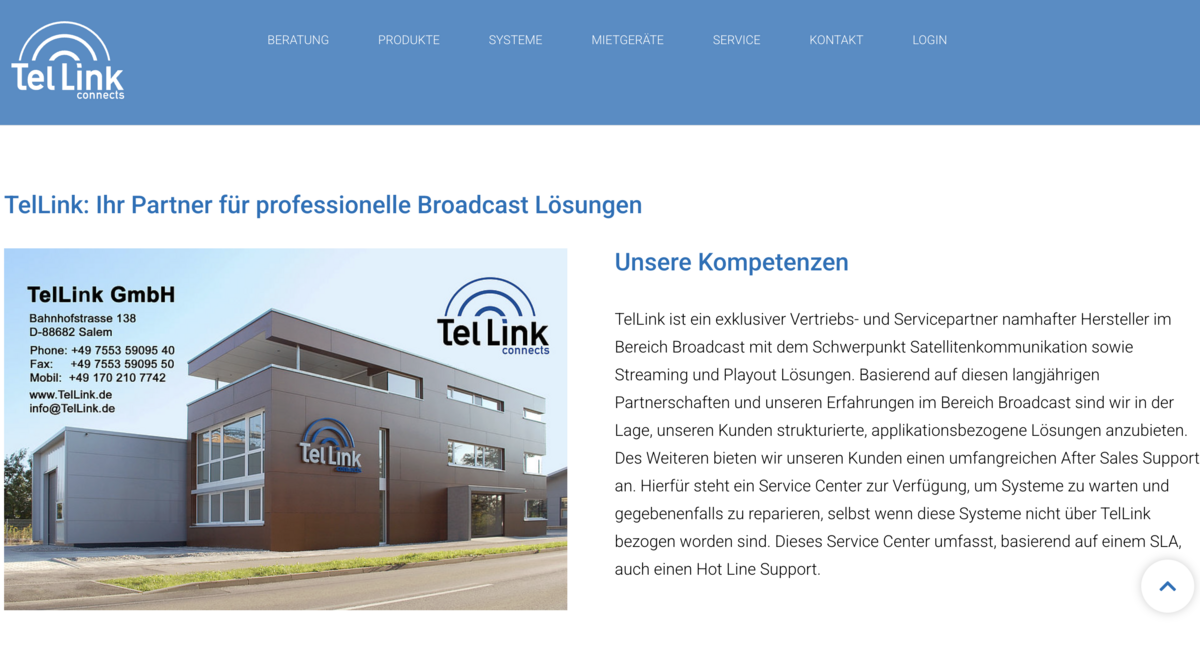 Für die TelLink GmbH haben wir einen umfassenden Relaunch der Webseite mit TYPO3 umgesetzt. Das Unternehmen ist exklusiver Vertriebs- und Servicepartner führender Hersteller im Bereich Broadcast, mit Schwerpunkt auf Satellitenkommunikation, Streaming und Playout-Lösungen.
